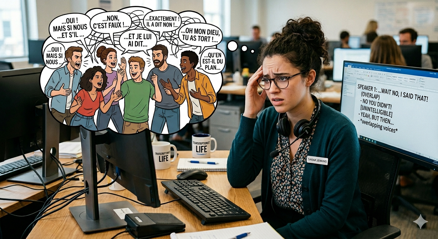 Il est également utile de rappeler que les logiciels de transcription automatique, de plus en plus utilisés comme premiers outils de traitement avant correction humaine, peinent encore davantage que les transcripteurs humains face aux chevauchements de voix. Les algorithmes de reconnaissance vocale sont calibrés pour traiter une voix à la fois. Lorsque deux ou trois personnes parlent simultanément, le logiciel produit une sortie incohérente qui allonge considérablement le temps de correction manuelle.